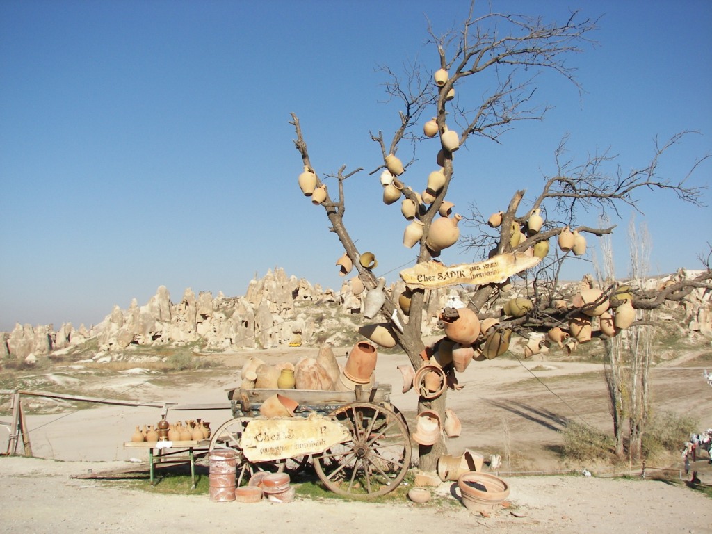 Una de las imágenes más fotografiadas Göreme en Turquía, es un árbol lleno de cerámica tradicional, ubicado en la ruta que nos lleva al Museo al aire libre de Göreme.